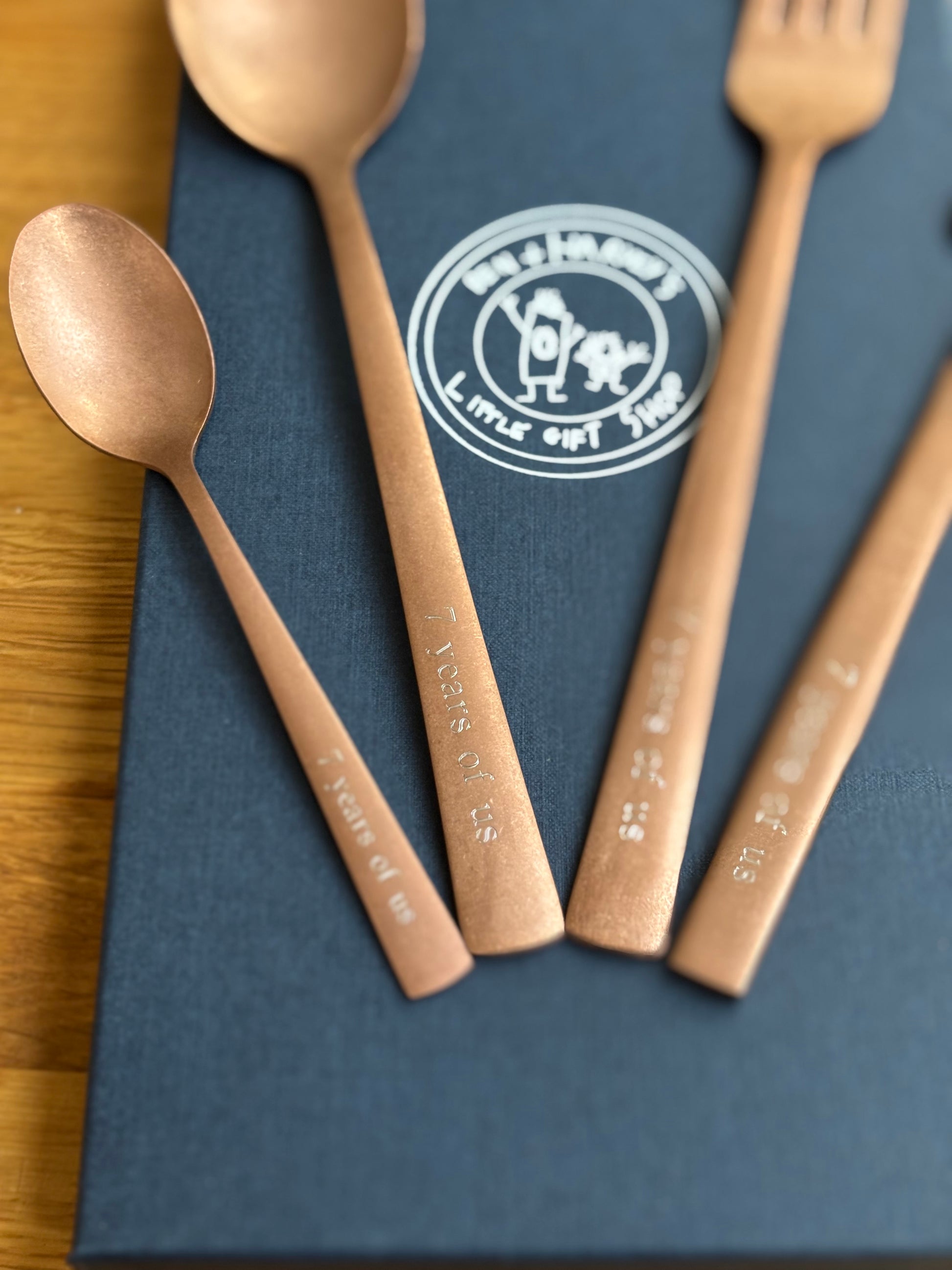 Engraved Copper Rose Gold Coloured Cutlery Set: Personalised Copper Wedding Anniversary Gift